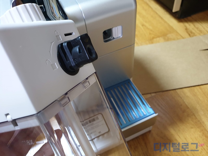 전면 우측에 도어를 열면 우유 거품기를 체결할 수 있는 커넥터를 볼 수 있다. 결합은 매우 간단하게 할 수 있다. 우유거품기가 체결되어야 라떼 등 우유 커피를 추출할 수 있다.