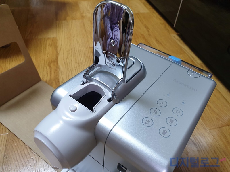 캡슐 삽입은 상단의 캡슐 뚜껑을 위로 열고 캡슐 홀더에 넣고 닫은 후에 커피 추출을 하면 된다.