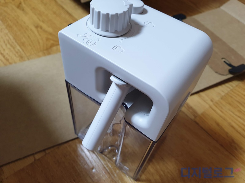 우유거품기 상단에는 다이얼과 버튼이 있는데 다이얼은 우유 거품의 질을 결정하고 우측의 버튼은 우유 추출 후 자체 스팀 세척 기능을 제공하는 버튼이다.