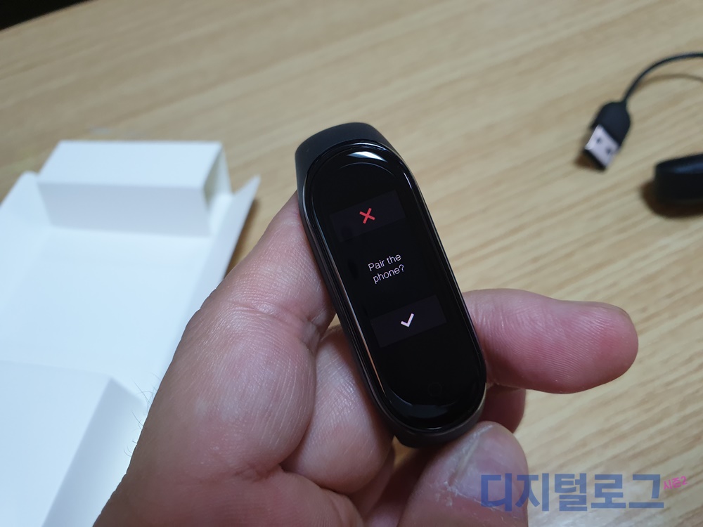 처음 전원을 켜면 미핏앱과 페어링을 하도록 안내한다. 구글플레이 및 앱스토어에서 미핏앱을 설치하고 실행하면 알아서 페어링을 해준다.