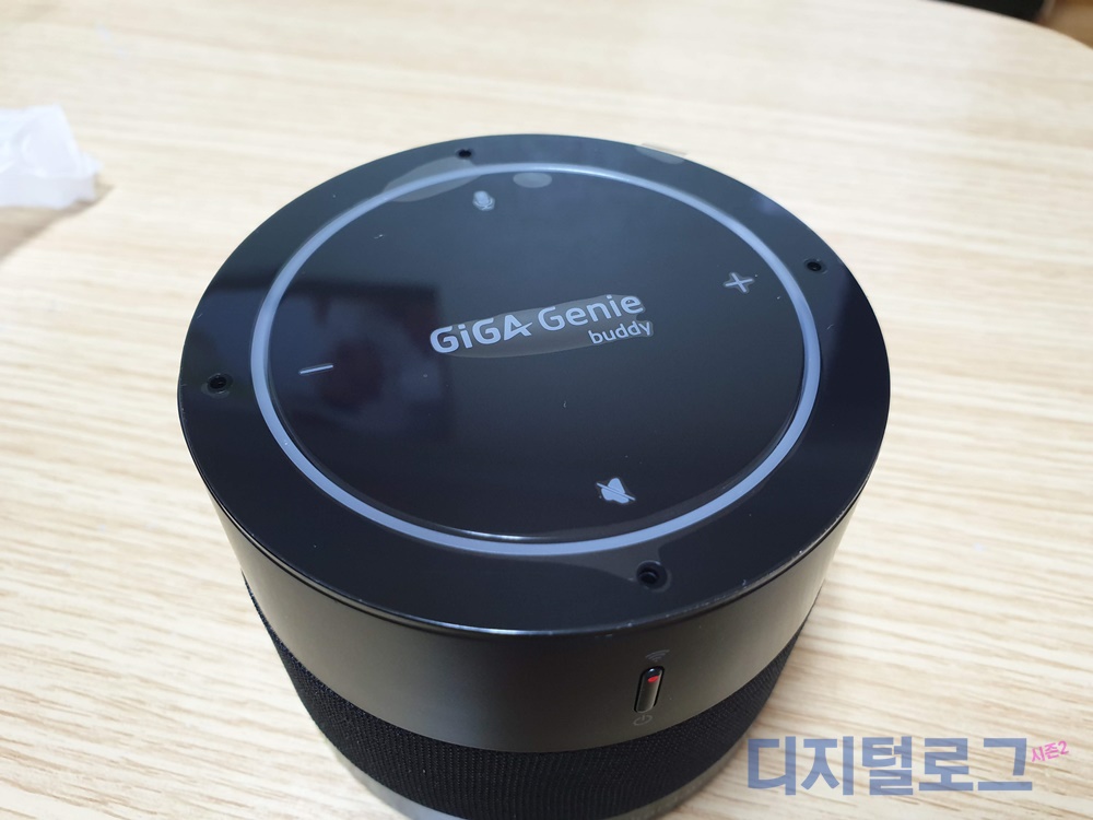 전면에는 전원 버튼이 있고 기가지니 버디의 작동 상태를 확인할 수 있는 LED가 위치하고 있다. 정상적으로 무선인터넷과 연결되어 작동 중이라면 파란색 LED가 켜져 있어야 한다.