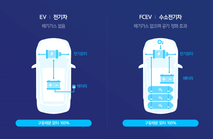 수소전기차의 경우 수소를 연료로 사용하다 보니 마치 CNG처럼 수소를 태워서 발생한 열로 동력을 얻는 것으로 알고 있지만 수소 전기차는 수소와 산소의 화학적 결합반응에서 발생하는 전기에너지를 이용해 모터를 구동시켜 동력을 얻는 방식이다.