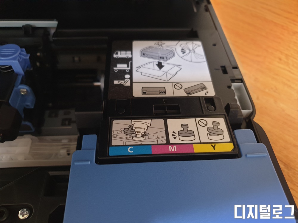 전면에는 좌측에 블랙 잉크통과 우측에 컬러 잉크통이 위치하고 있다. 일반적으로 측면에 무한잉크통이 별도로 달린 제품과 달리 본체 전면에 일체형으로 내장된 무한잉크통으로 제품의 완성도도 높았고 잉크 잔량을 직관적인 확인이 가능하다는 장점이 있다.
