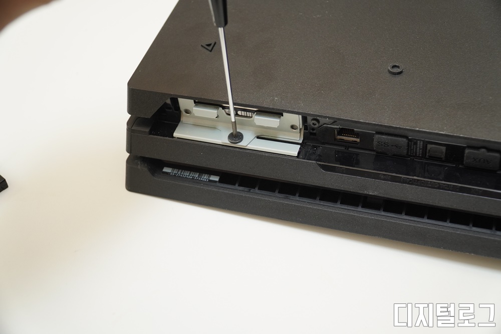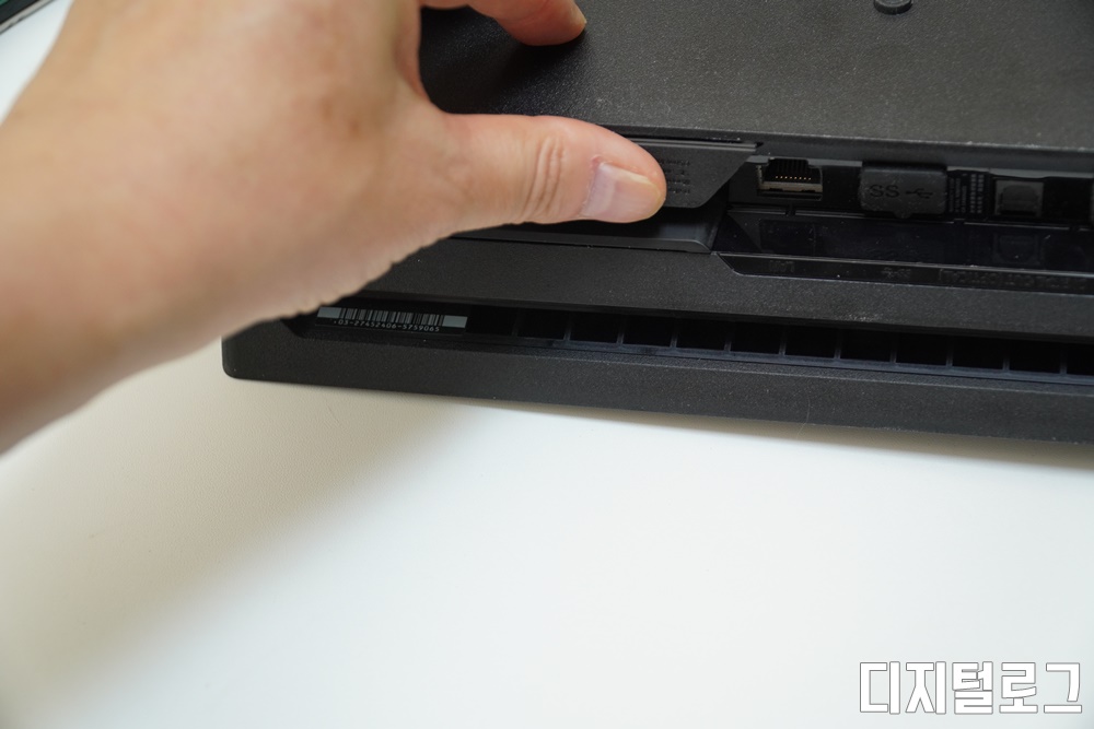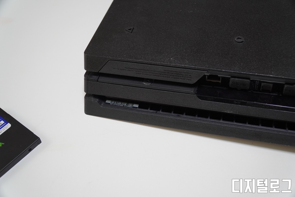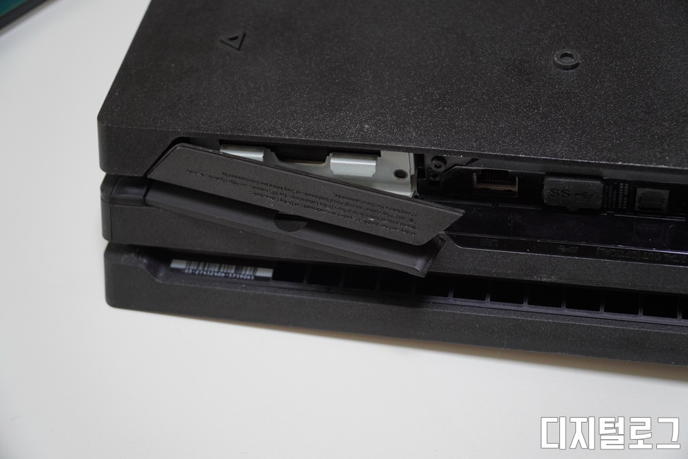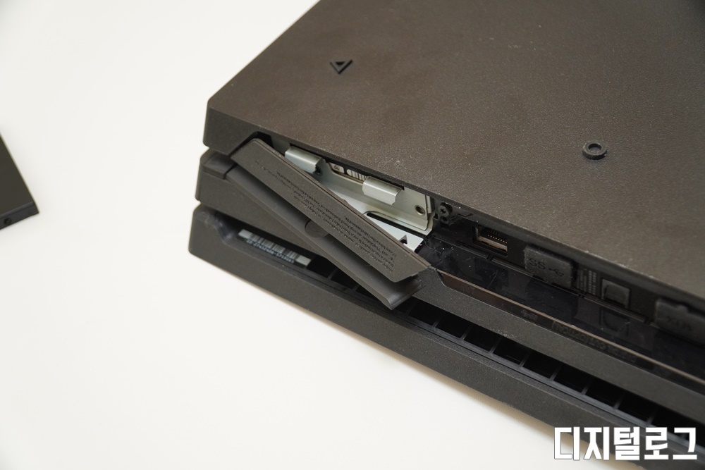 그럼 실제 SSD를 PS4프로에 장착해보자, 먼저 PS4 후면 좌측 상단의 HDD 슬롯의 커버를 열어주어야 한다.