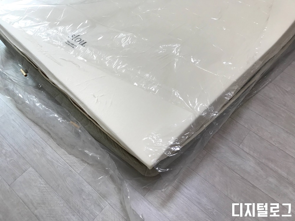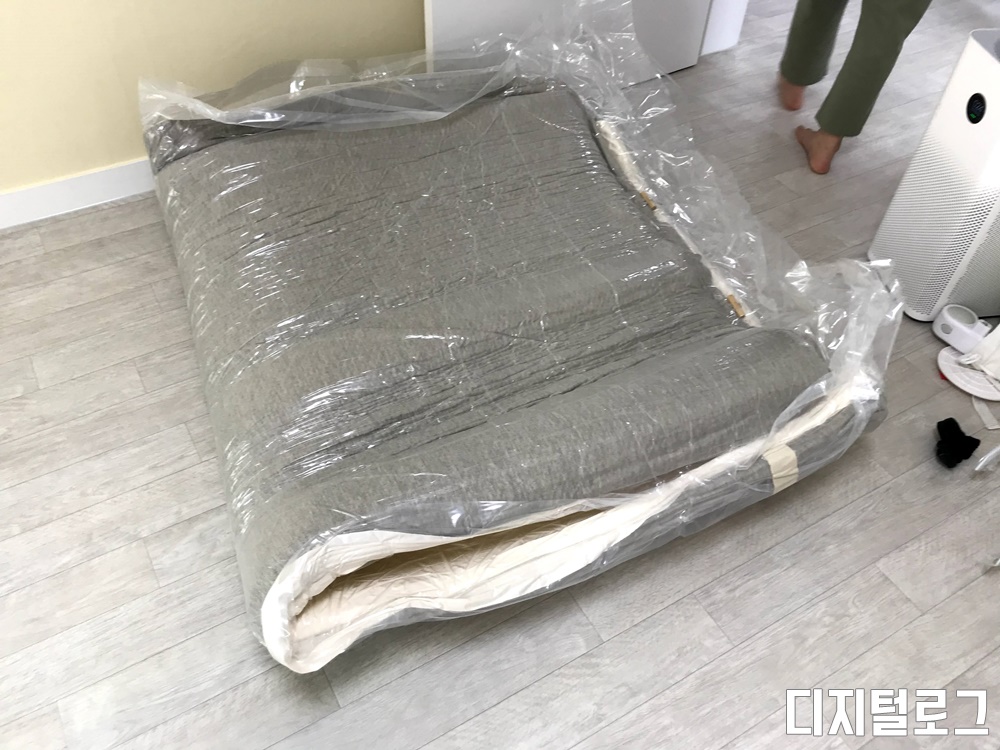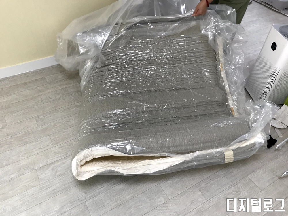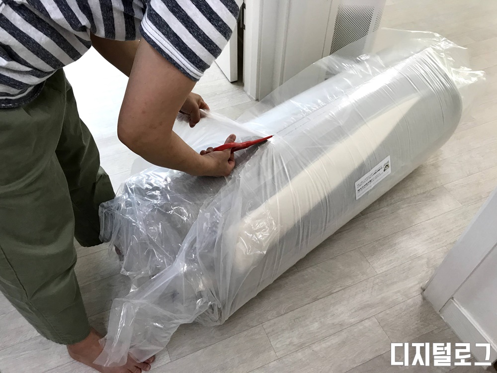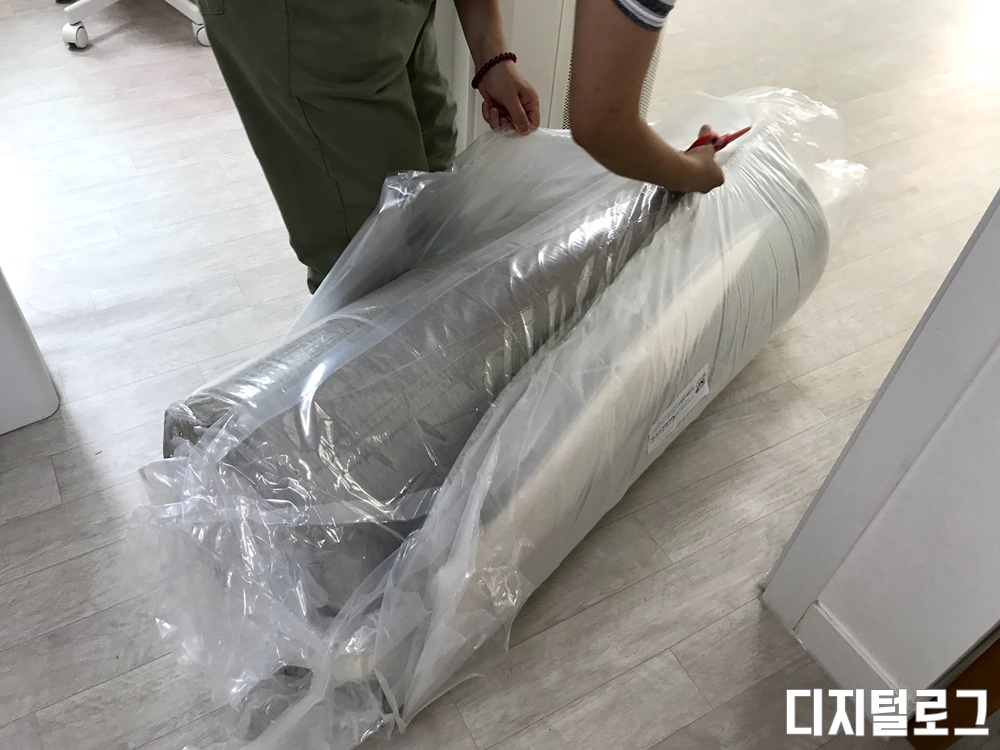 보통 침대의 경우에는 두사람 정도 전문 배송업체에서 배송이 되는 것이 일반적인데 슬로우 온라인으로 주문 후 택배를 통해 제품을 받을 정도로 부피가 크지 않았다. 압축 비닐에 돌돌 말려서 웬만한 소파 쿠션 크기로 배송되었는데 무게는 엄청났다. 퀸 사이즈의 경우는 남자 혼자 다루기 쉽지 않을 정도로 무겁다.