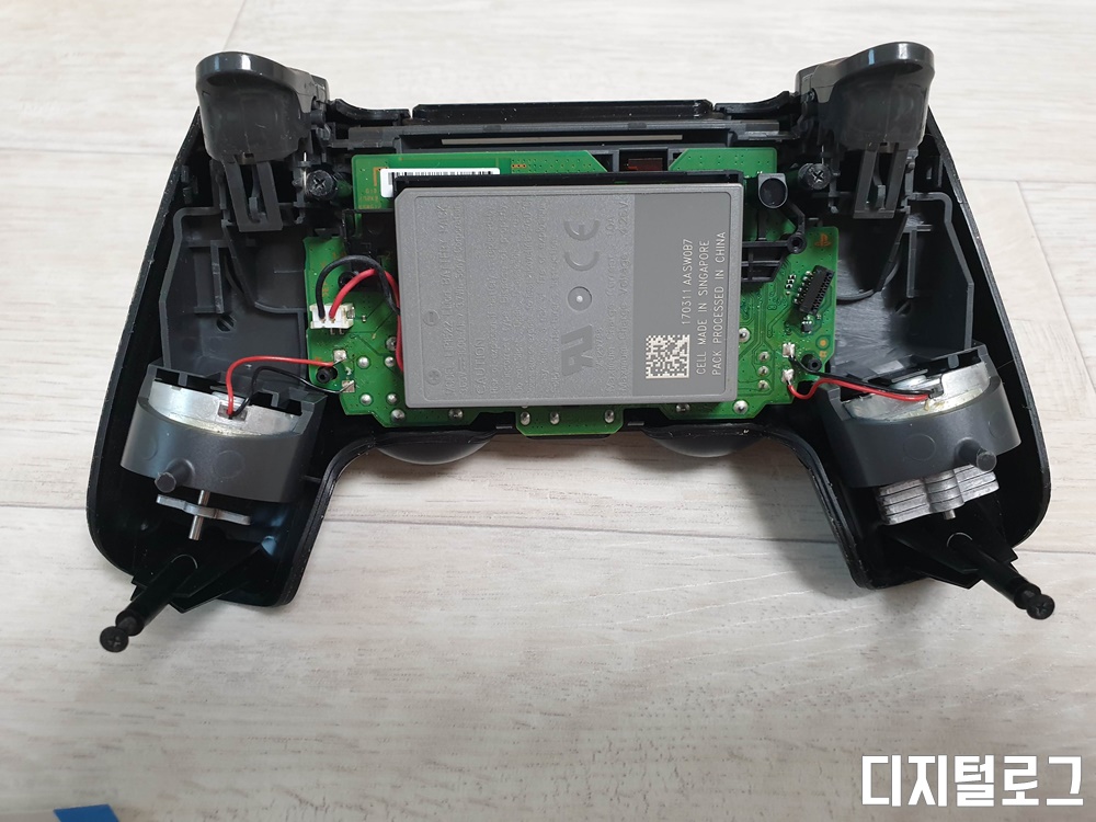분해된 듀얼쇼크이다. 상판에는 배터리가 탑재되어 있고 하판에는 충전을 위한 충전보드가 위치하고 있다.