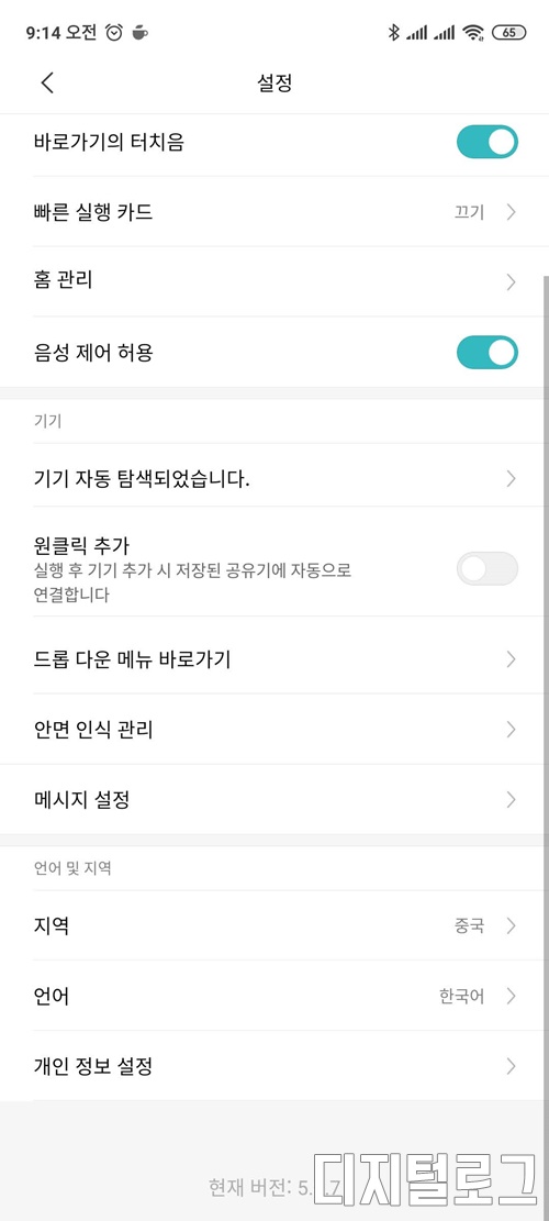 미홈앱의 설정으로 들어가면 지역과 언어 설정 항목이 있을 것이다. 보통 지역은 한국, 언어는 한국어로 되어 있을 것이다.