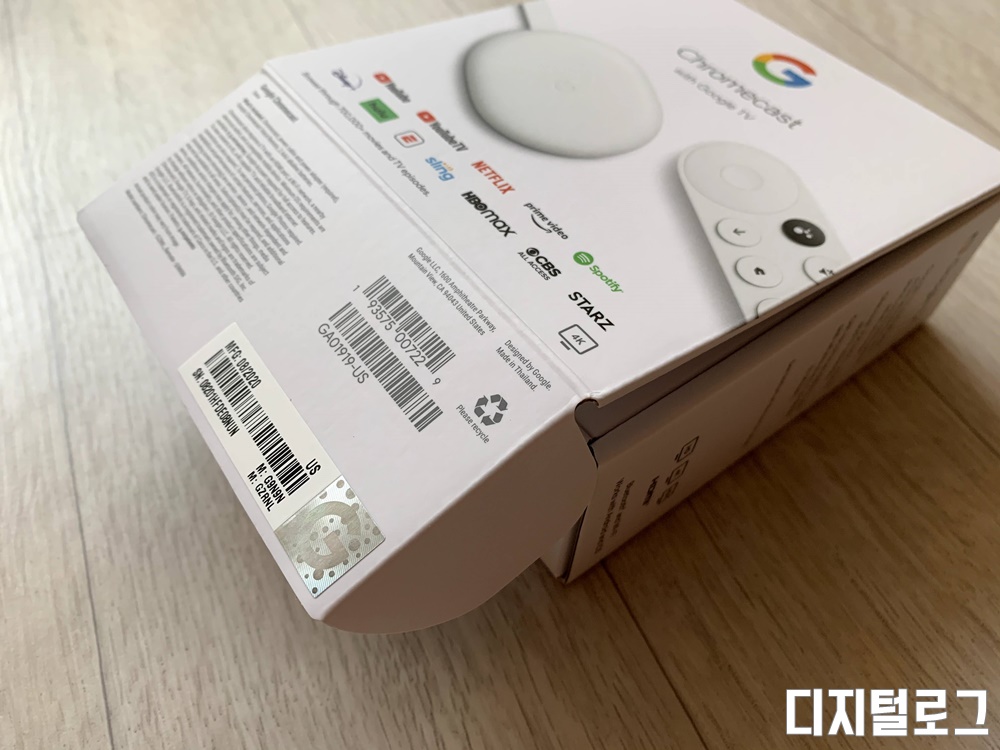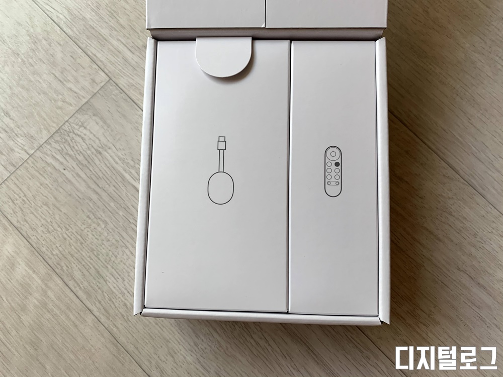 박스 하단에는 구글의 정품임을 인증하는 홀로그램 스티커가 부착되어 있다. 박스를 열면 작은 박스 2개가 눈에 띈다. 왼쪽 박스가 크롬 케스트 본체가 들어있는 박스이고 오른쪽은 리모컨이 들어있는 박스이다.