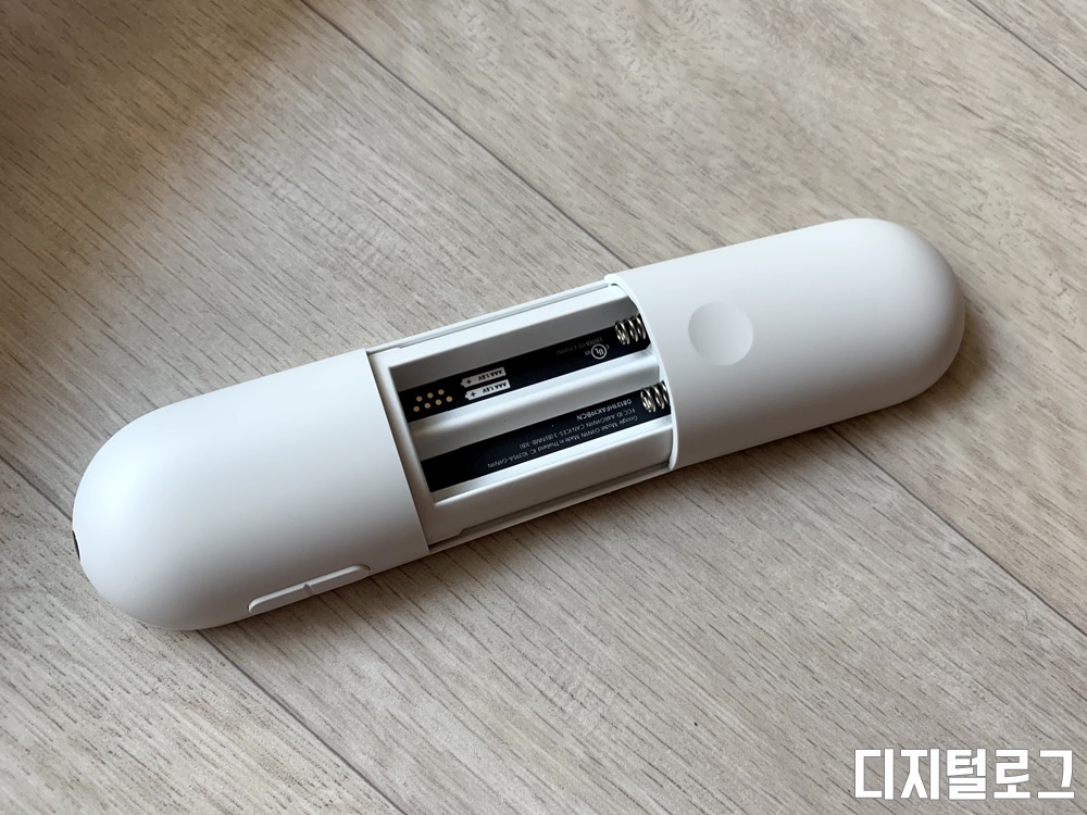 리모컨 우측에는 볼륨 조절 버튼이 있다. 배터리는 AAA 2개가 사용되며 하단 아래의 배터리 커버를 열어서 넣을 수 있다.