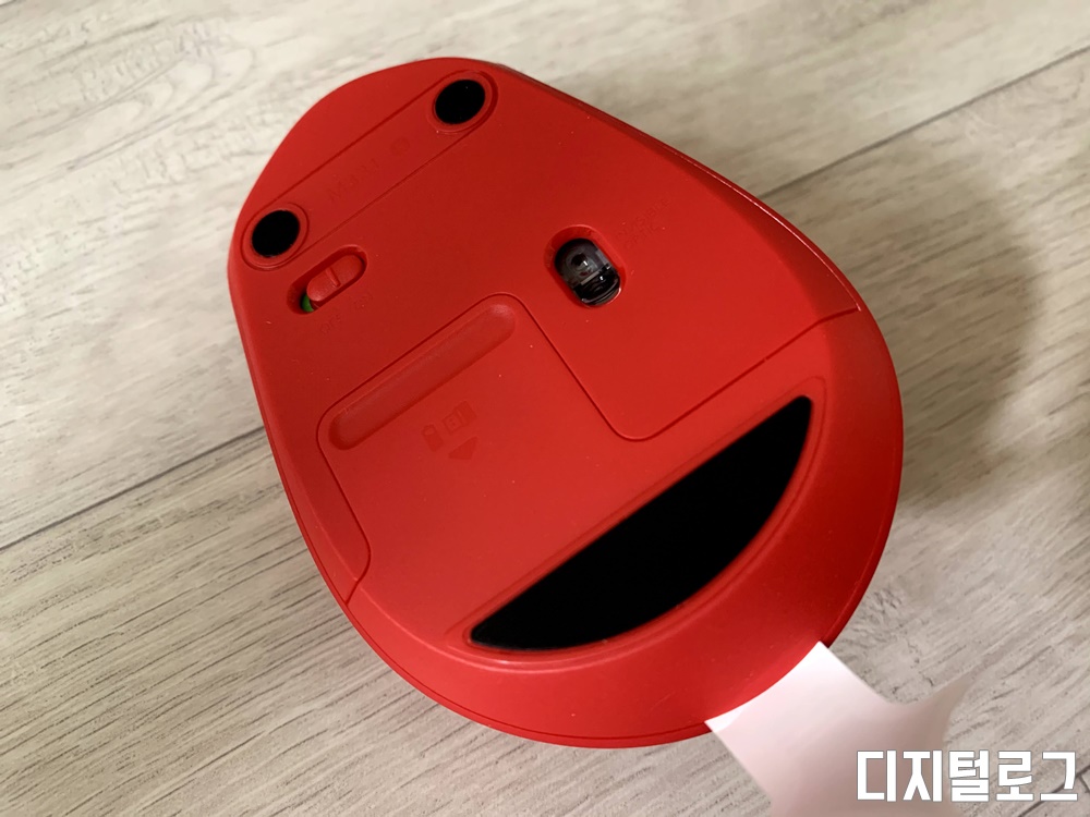 바닥면에는 3개의 패드가 부착되어 있고 전원버튼, 마우스 센서 그리고 배터리 수납공간이 있다.