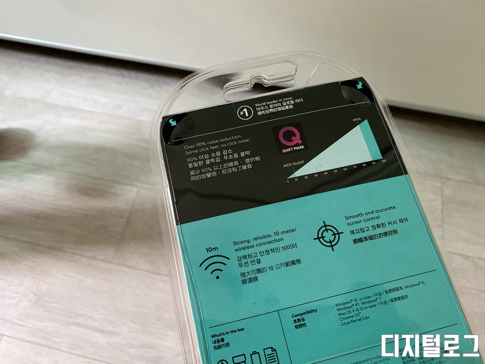 포장은 플라스틱 케이스에 담겨 있는데 이런 포장을 뜯을 때 손을 다치는 경우가 종종 있었는데 로지텍 M331은 후면에 쉽게 개봉을 할 수 있도록 점선 가공이 되어 있어서 안전하게 포장을 해체할 수 있다.