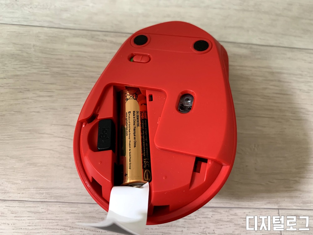 배터리 수납공간에는 전용 수신기가 탑재되어 있다. 주로 마우스를 노트북에서 사용하여서 블루투스 마우스를 구매할 까 하다. 윈도 10의 고질적인 블루투스 마우스 멈춤 현상이 싫어서 전용 수신기가 있는 M331을 구매하였다.