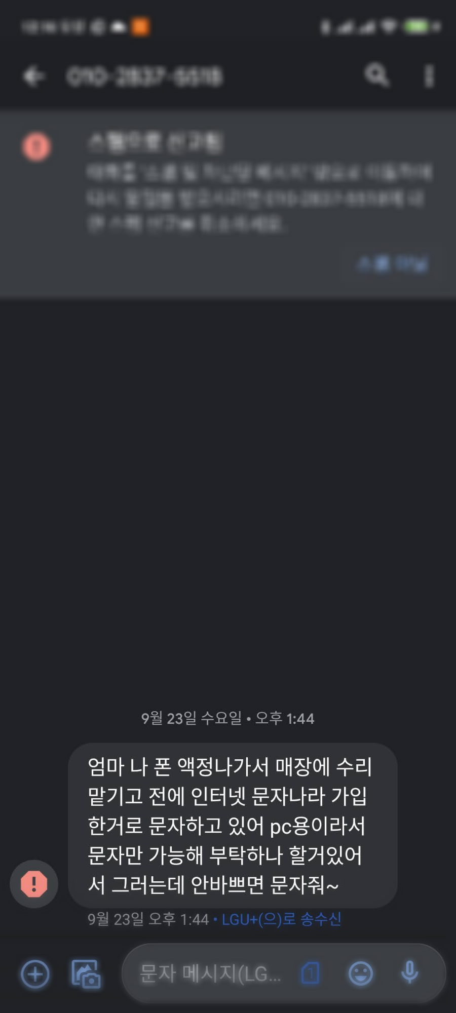 최근 들어 보이스피싱 대신 문자나 카카오를 통한 스미싱(문자로 하는 피싱)이 유행이다. 그 내용은 주로 가족을 사칭하여 돈을 갈취하는 것이다.