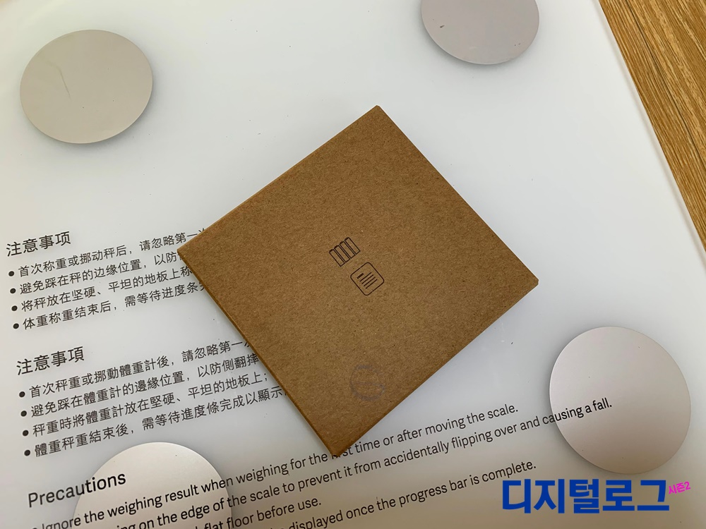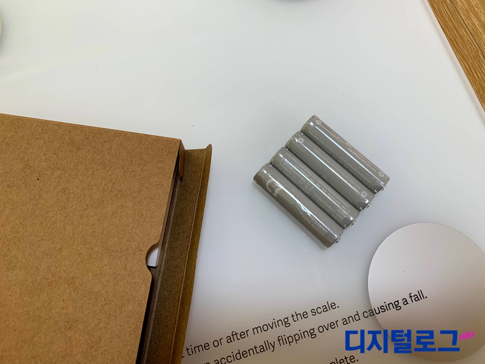 본체인 체중계를 꺼내면 아래에 작은 상자가 있는데 제품설명서와 체중계에 사용할 AAA 배터리 4개가 들어있다.