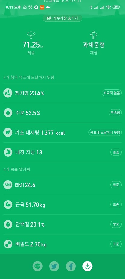 샤오미 체중계2를 통해 측정한 결과는 샤오미에서 제공하는 mi fit앱을 통해서 자세하게 확인이 가능하다.