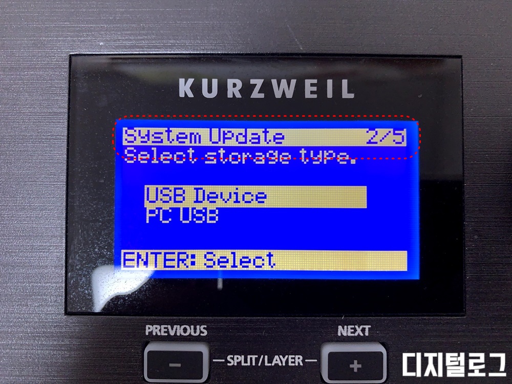 시스템 업데이트 메뉴에는 USB 또는 PC 연결 방식을 선택하여 펌웨어를 업데이트할 수 있다. USB에 펌웨어 파일을 담았으니 USB Device를 선택(엔터) 합니다.