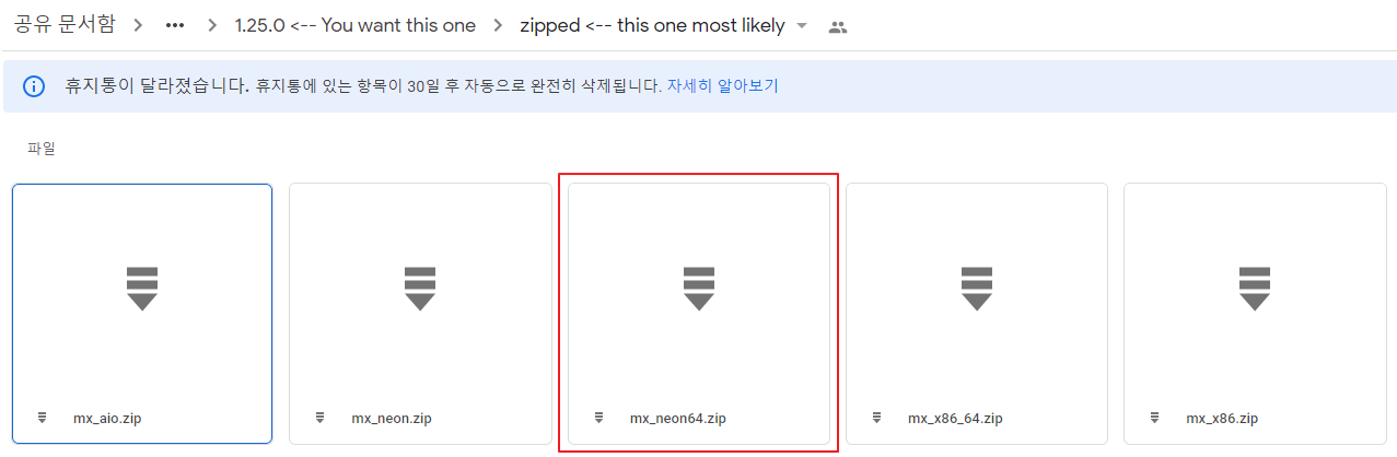 여러 파일이 있는데 최근 사용되는 스마트폰은 대부분이 64bit CPU를 탑재하고 있으니 mx_neon64.zip을 클릭하여 다운로드하면 된다.