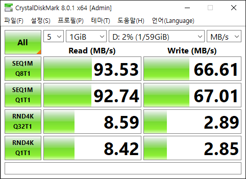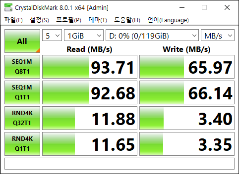 순차 읽기 93.53MB/s 쓰기 66.61MB/s로 측정되었다. 샌디스크의 뻥 스펙을 확인한 순간이었다. 읽기 150MB/s이라고 되어 있지만 100MB도 구현해주지 못했다. 이 정도면 사기 판매 아닌가 하는 생각도 들었다.