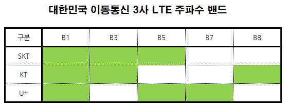 국내 이동통신 3사가 지원하는 주파수 밴드는 아래와 같다.