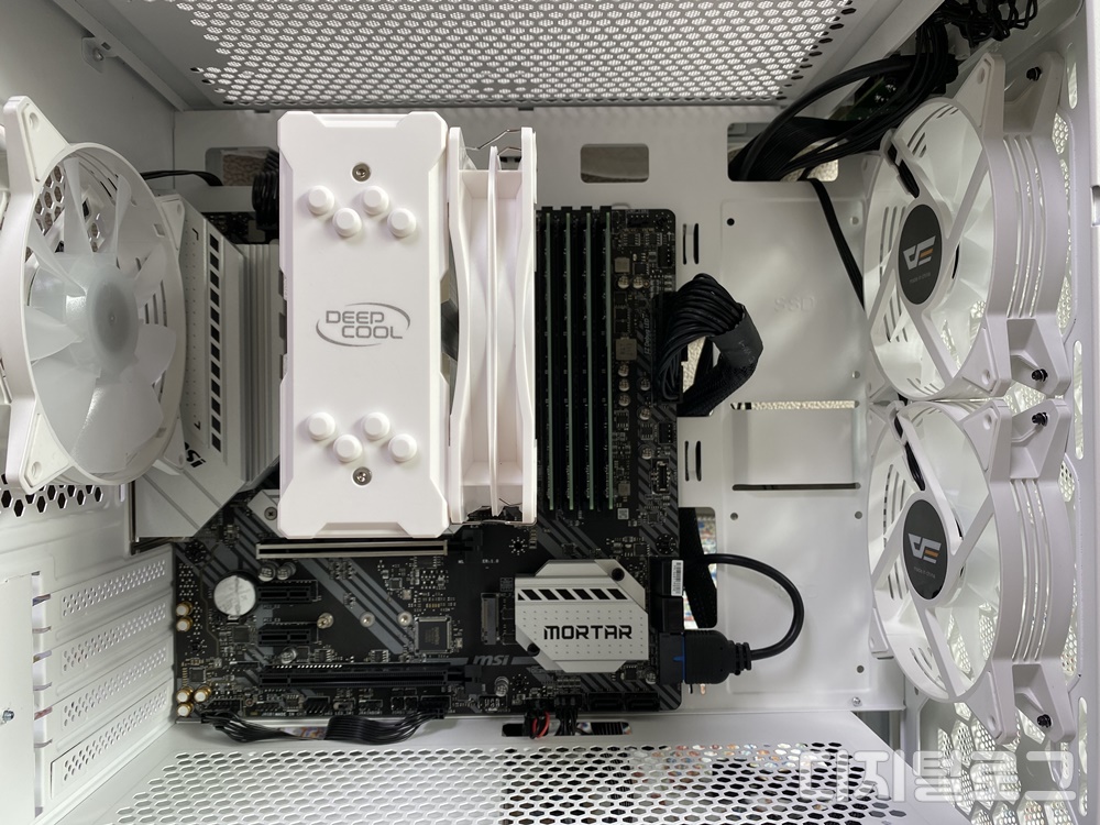 조립이 끝난 상태이다. 케이스는 다크플래시의 DLM21을 사용했는데 기본으로 장착 된 팬이 부족하여 추가로 팬을 구입하여 장착하여 주었다.