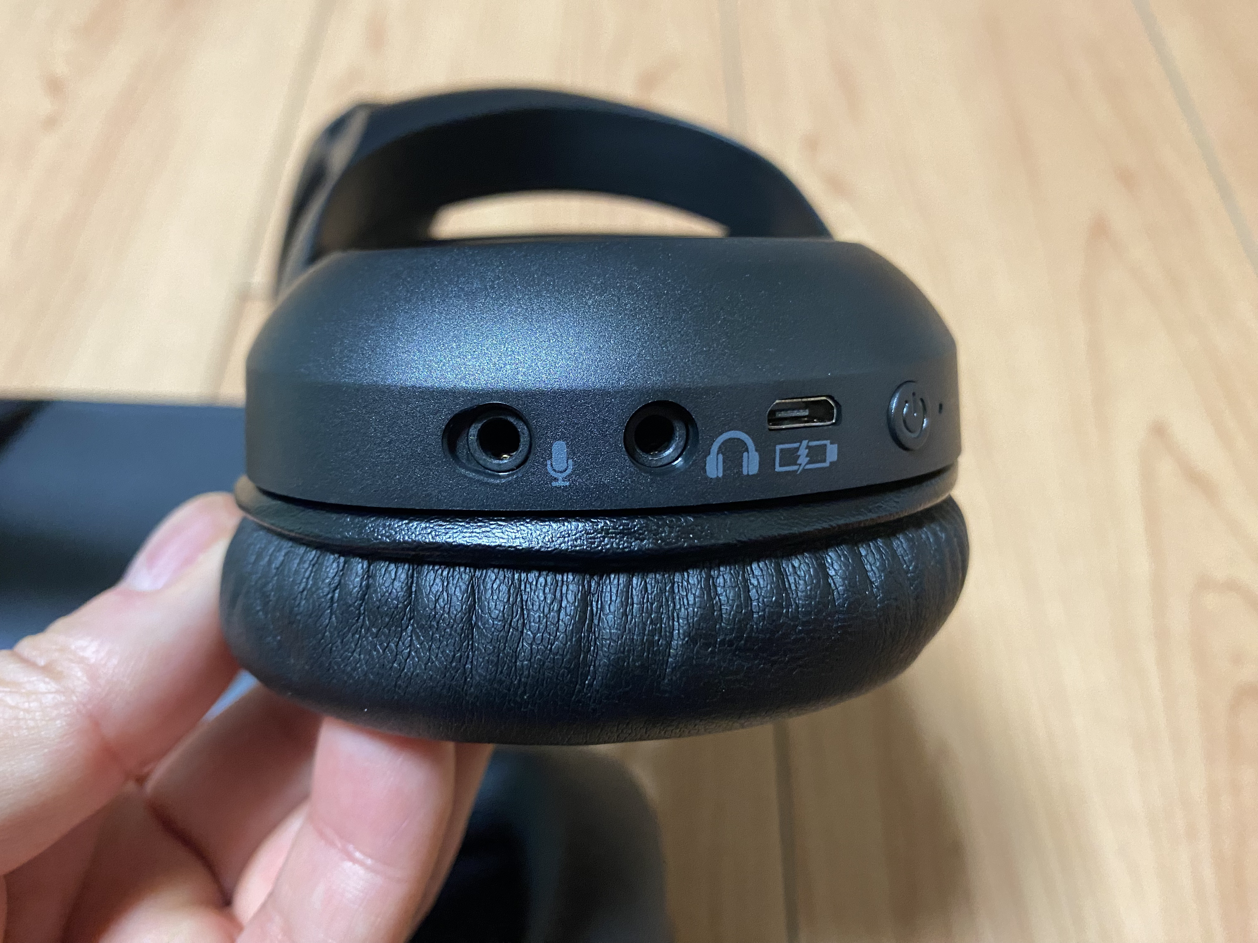 왼쪽 유닛 하부에는 마이크 단자, 외부 이어폰이나 헤드폰을 연결할 수 있는 단자, 그리고 마이크로5핀 충전단자, 전원 버튼이 제공된다.